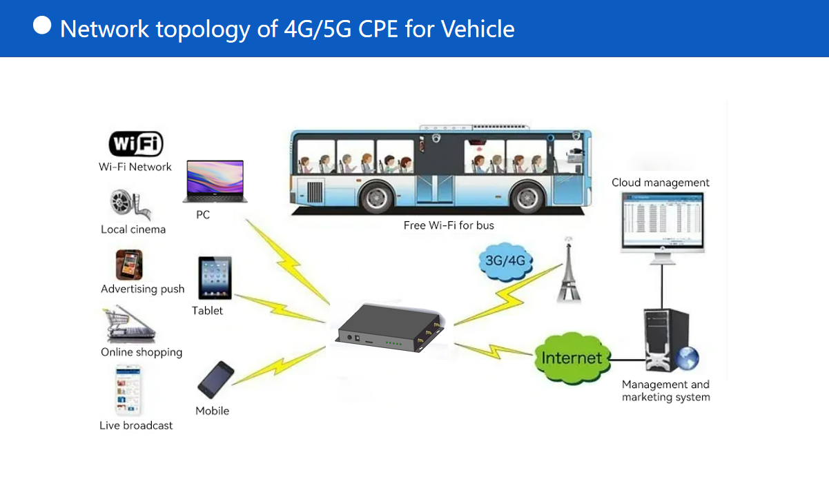 Taxis and buses are the mian public transportation in the city. They run in all areas day and night. From the perspective of vehicle safety, video monitoring is required. From the perspective of taxi driver service, the operating company needs to execute management plans. From the perspective of passengers, high-speed wireless network access and more entertainment content are required. 4G / 5G routers emerge all of this requirement
